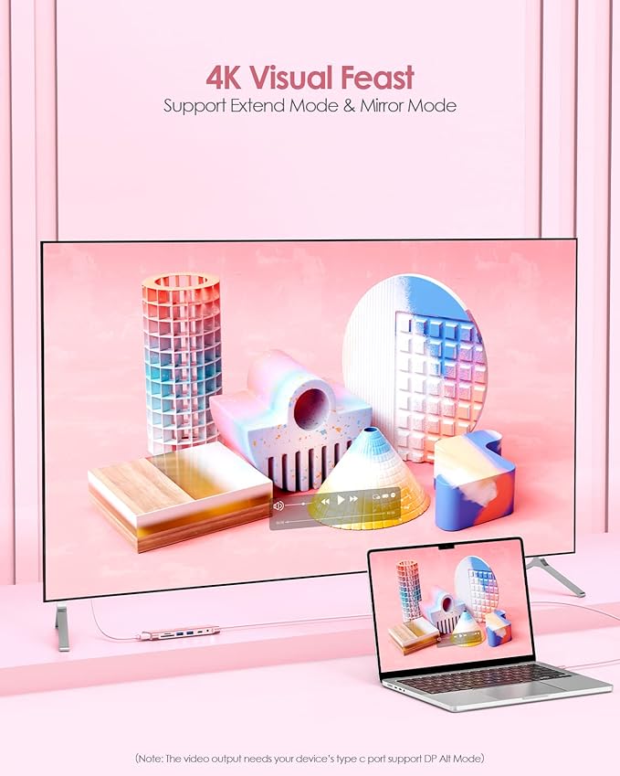 LENTION 3.3FT Long Cable USB C Hub with 4K HDMI, 2 USB 3.0, Card Reader, Aux, Type C Data/Charging Compatible 2023-2016 MacBook Pro, Mac Air/Surface, More, Stable Driver Adapter (CB-C37, Rose Gold)