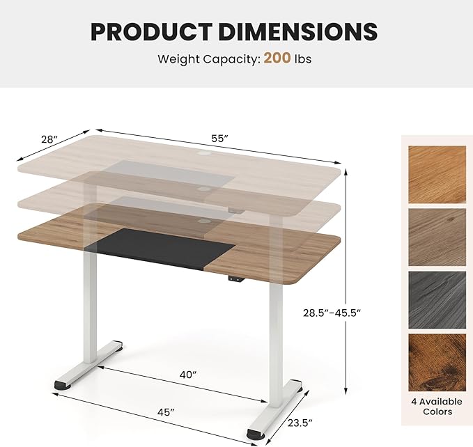 - Make Standing Work Possible: Tired of sitting for long hours? Take a look at this height-adjustable desk. The height of this sit-stand desk can be adjusted between 28.5"-45.5". Just press the control button next to the desk and you can adjust the height of the desk at any time for sitting or standing work.