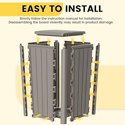 - Quick Install - This outdoor trash bin comes with a detailed user manual. No screws or tools required, just snap the panels together and the installation can be completed in about 10 minutes.