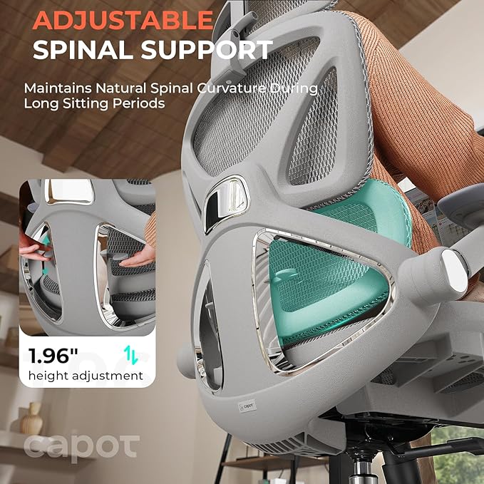 CAPOT Ergonomic Mesh Office Chair, Adjustable Lumbar High Back Desk Chair 400lbs, 4D Flip-up Arms, 3 Tilt Backrest, 3D Headrest, PU Wheels, Swivel Rolling Computer Seating for Long Desk Work - Grey